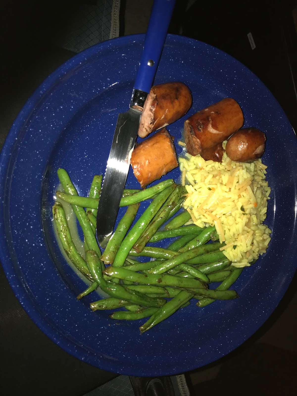 I cooked up some fresh green beans on our camp stove, rice in the Jet Boil, and Neil grilled up some Polska Kielbasa. It was so yummy for our first night of camping.