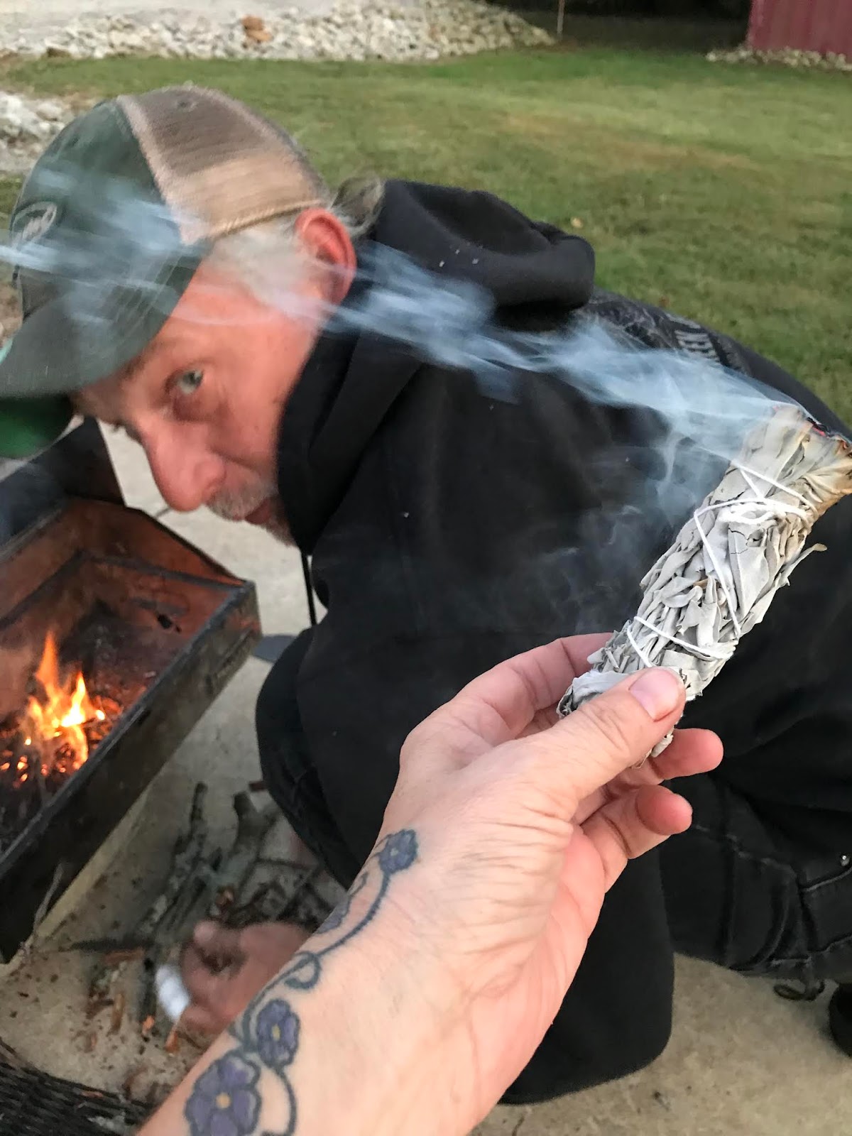 Before dinner while Neil was working on the fire,I broke out the sage. I needed to do a little smudging to get rid of Neil's Negative Energy. I'm not sure he thought it was such a good idea. The negative energy was the bad luck he kept having with getting Maggie May to run. Then the tire blow out.