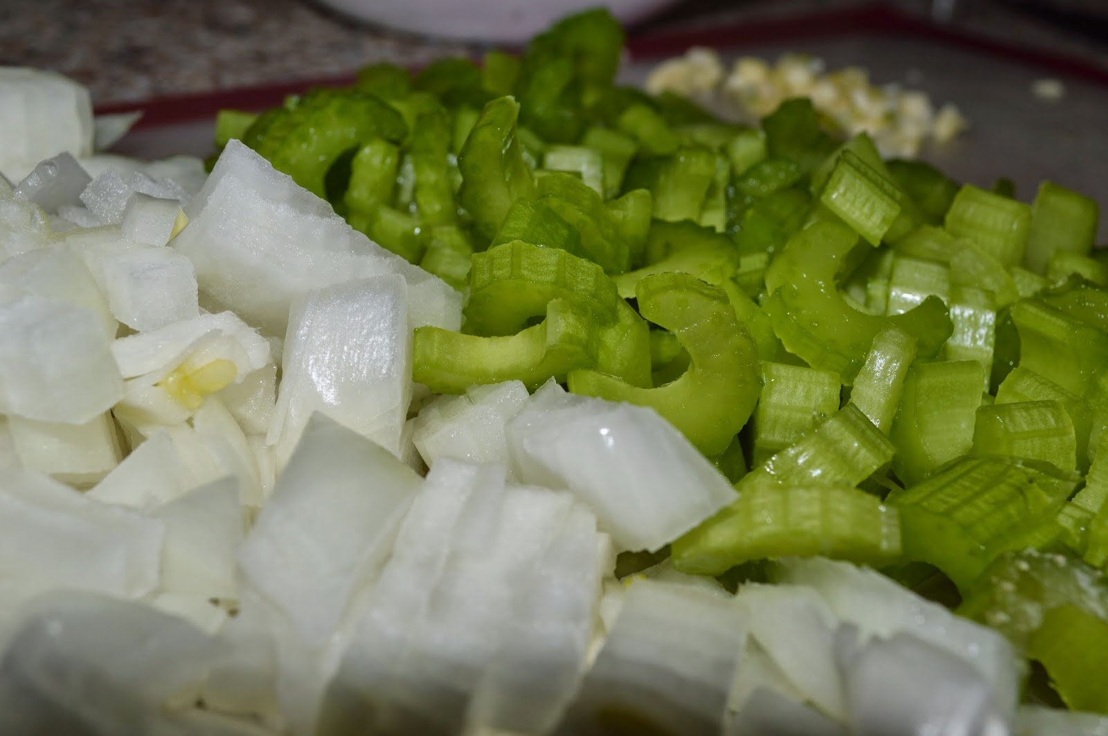 Then layer onion, celery and okra overtop. For a firmer okra add it 2 hours before cooking is complete. Or you can replace the okra with carrots. Liquid should just cover vegetables. Do not stir. Cook on low for at least 4 to 6 hours. Remove bay leaves and stir before serving.