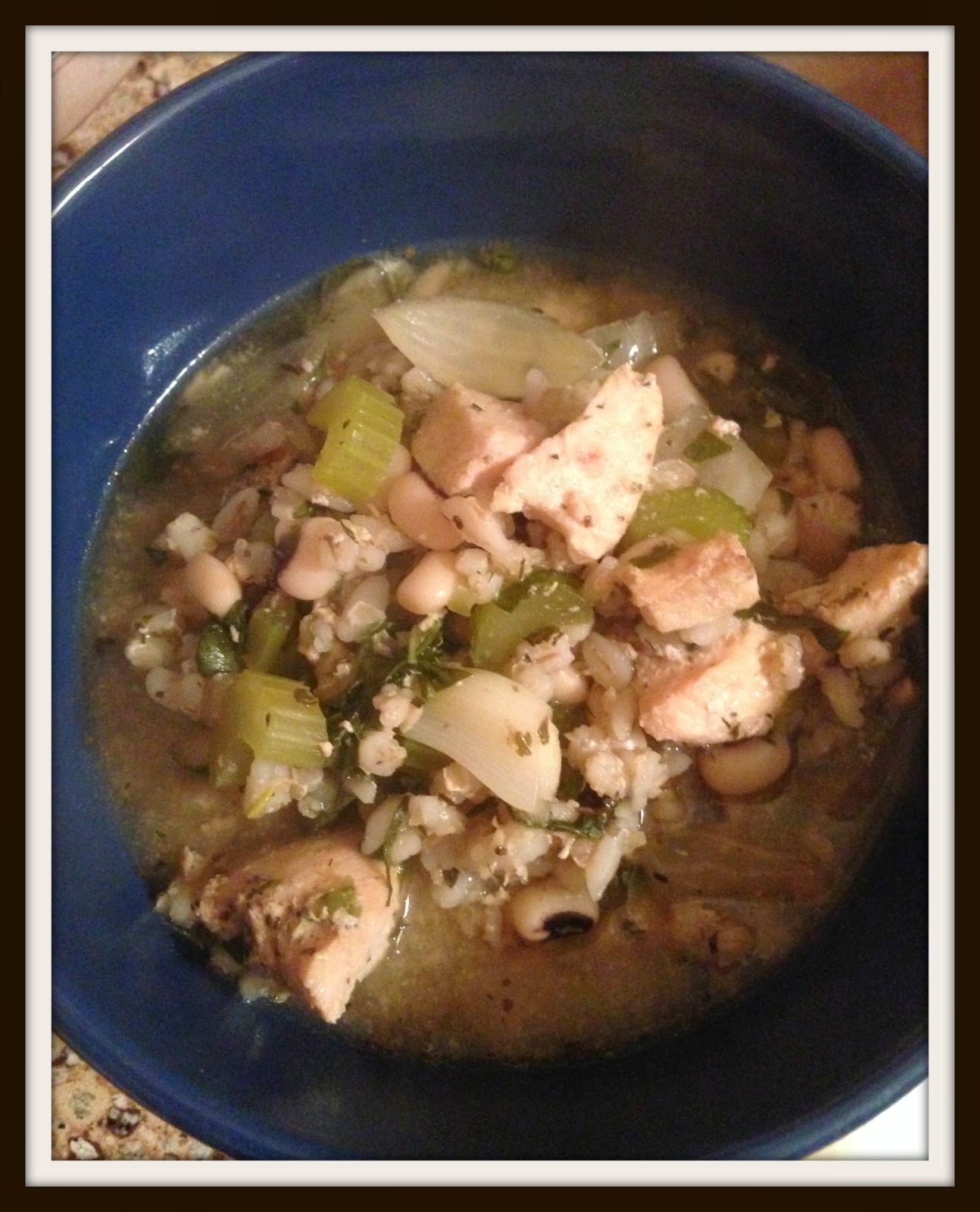 Add the cubed uncooked chicken breasts, black-eyed peas and barley.