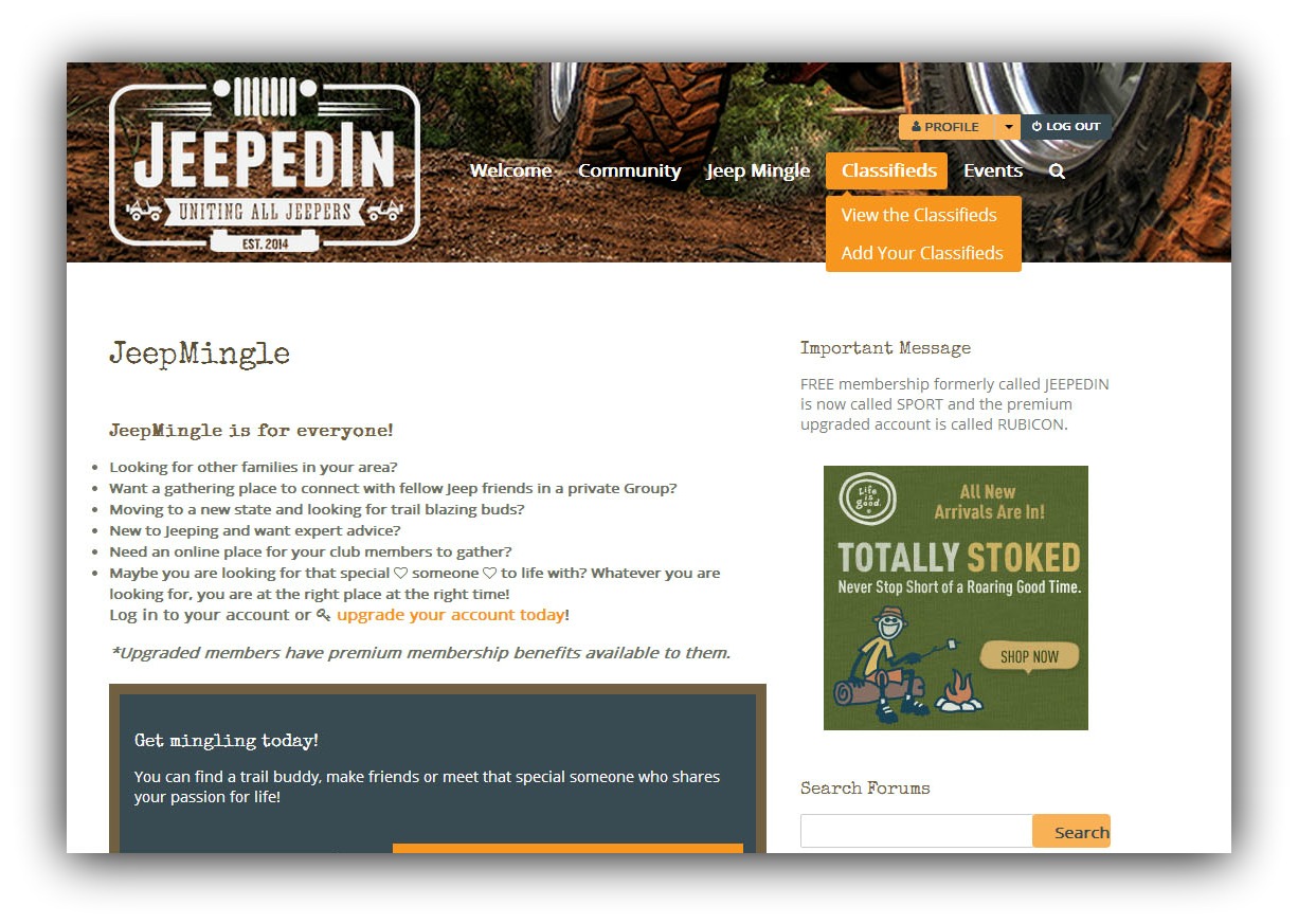 It’s an online virtual hangout for Jeepers and outdoor enthusiasts. Simply, a place to hang out with other Jeepers, find events and share life. You can meet a new friend, get technical advice, and maybe find that special someone you’ve been looking for! We offer a FREE membership called SPORT and an upgraded membership for less than a cup of java/month called RUBICON with premium benefits.