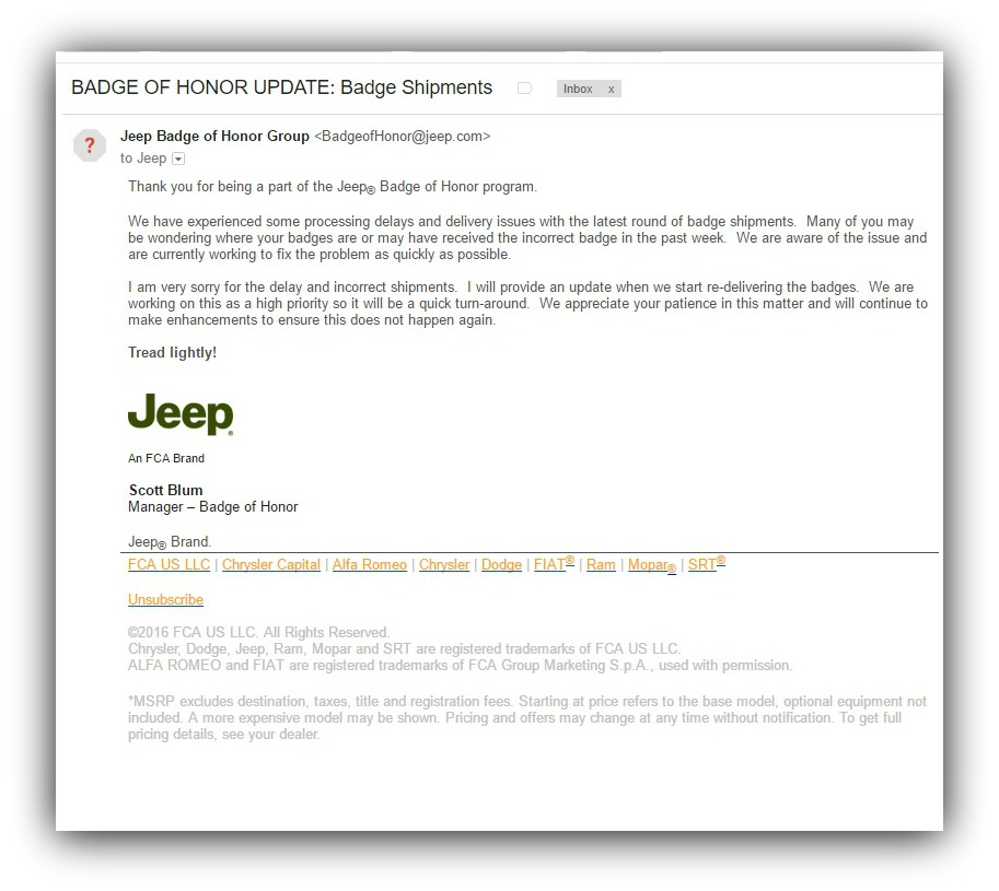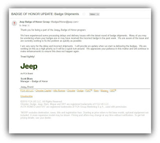 A couple of weeks ago I wrote about my disappointment in the Jeep Badge of Honor program, and how I still haven't received my trail badges.