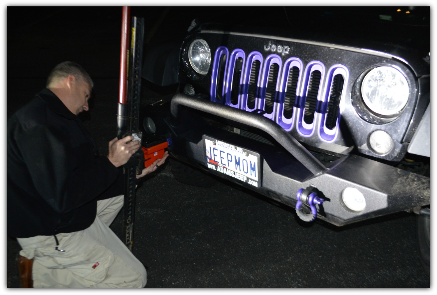 Well, the folks at JeepsNeeds.com have decided to add another color to their selection of colors for their new off-road product the DLA. They are going to call it Jeep Momma Purple to thank me for my help with the design of this product. When Chris and I first met up so he could demonstrate how the DLA worked, we tried using the d-ring on my Jeep. Well… it didn’t work. So they took it back to the drawing board and made some small modifications. The issue was my Warn D-ring was too wide, so they widened the opening of the DLA. They also made the holes for the pin just slightly bigger to account for some possible casting issues with the hi lifts.