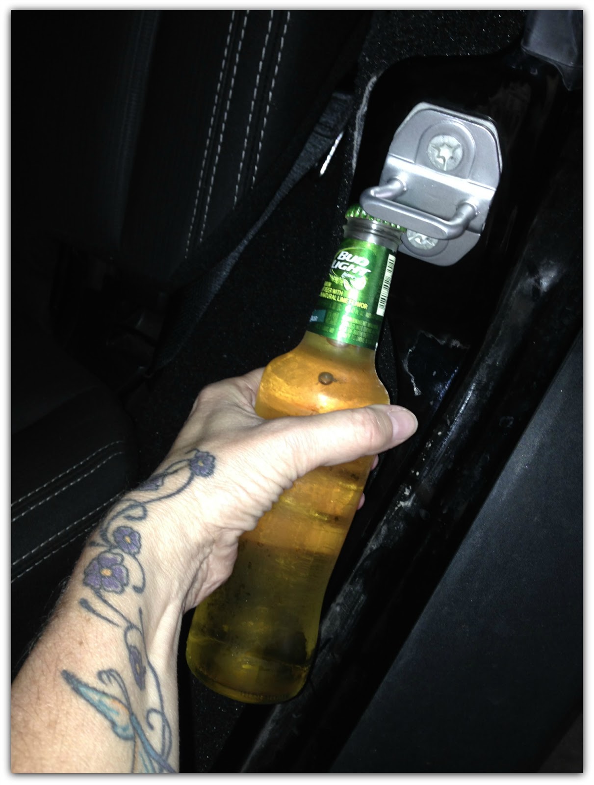 When you are wrenching out in the garage and you don't feel like walking into the kitchen to get a bottle opener you can just use your door. The silver latches attached to the body of the Jeep double as a bottle opener.