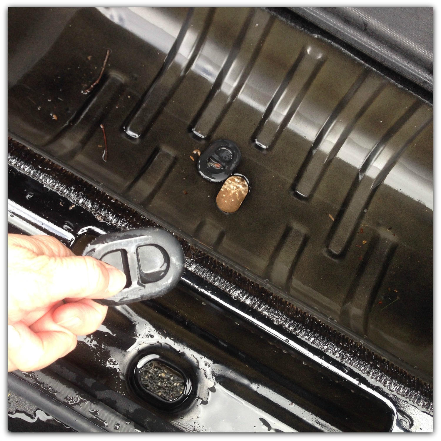 Little did I realize the rain water pooled in my Jeep's trunk, the storage area for my jack, and under the rear seats. I remember other Jeepers talk about drain plugs, so I went in search of mine. In the trunk and the jack storage space, they were easy to find.