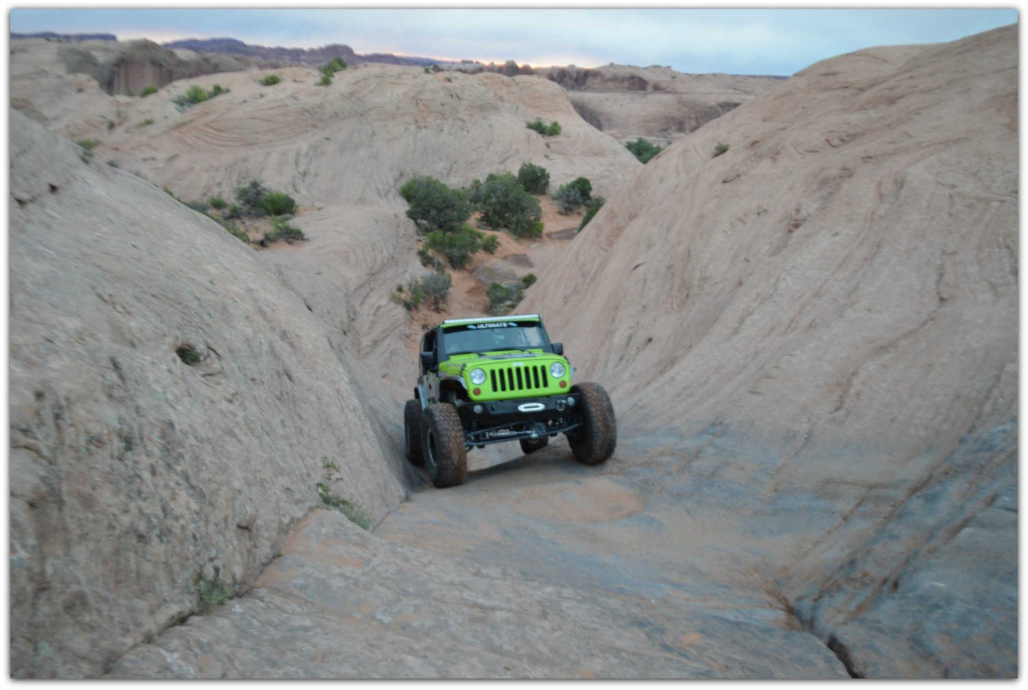 Hell's Revenge is trail-rated for a 6. Stock 4x4 vehicles can make it through the trail with by-passes for some of the more challenging obstacles. There are steep climbs and descents, along with some edges that are not for the faint of heart. The steep slopes, however, are not technically difficult because of the excellent traction on the sandstone rock.
