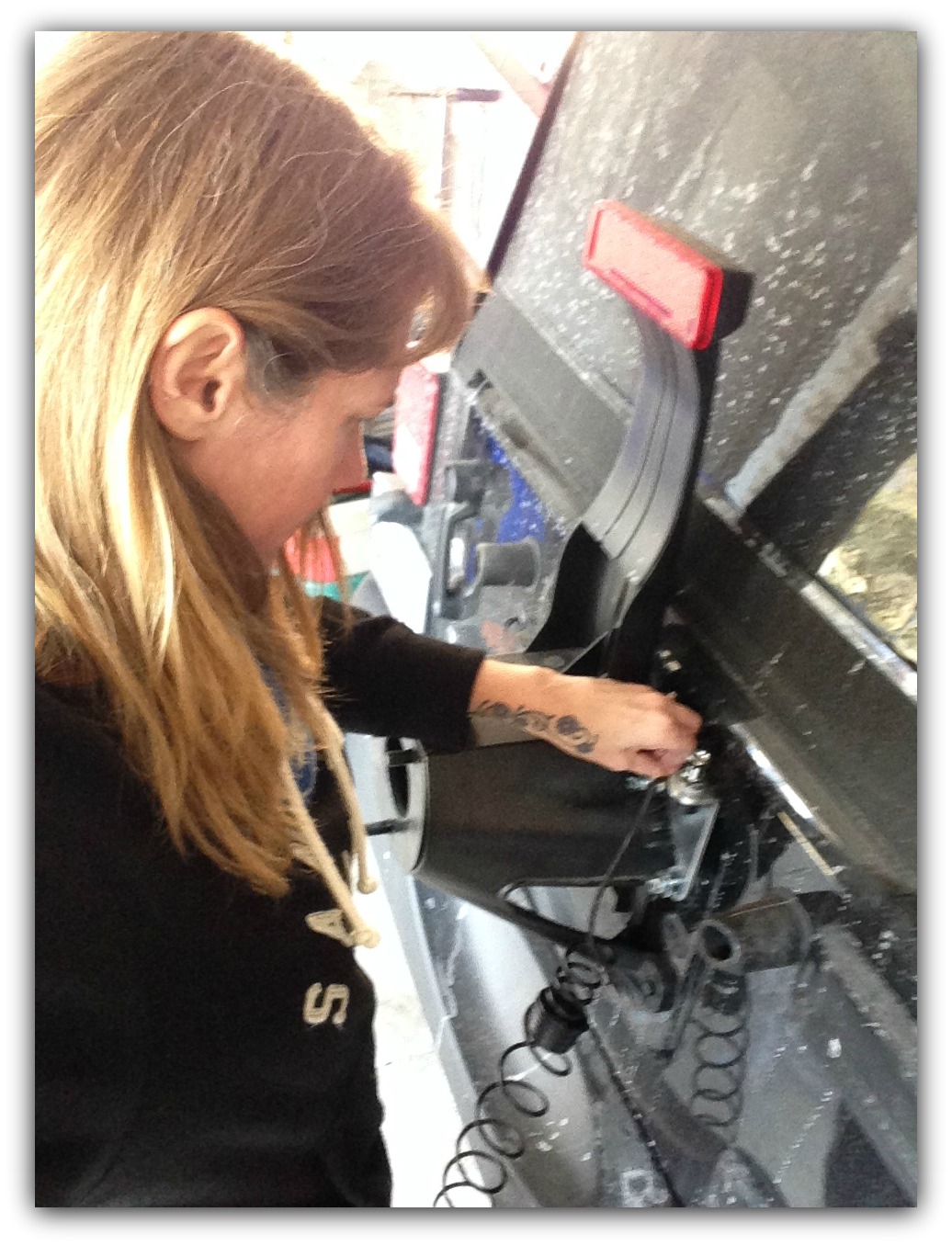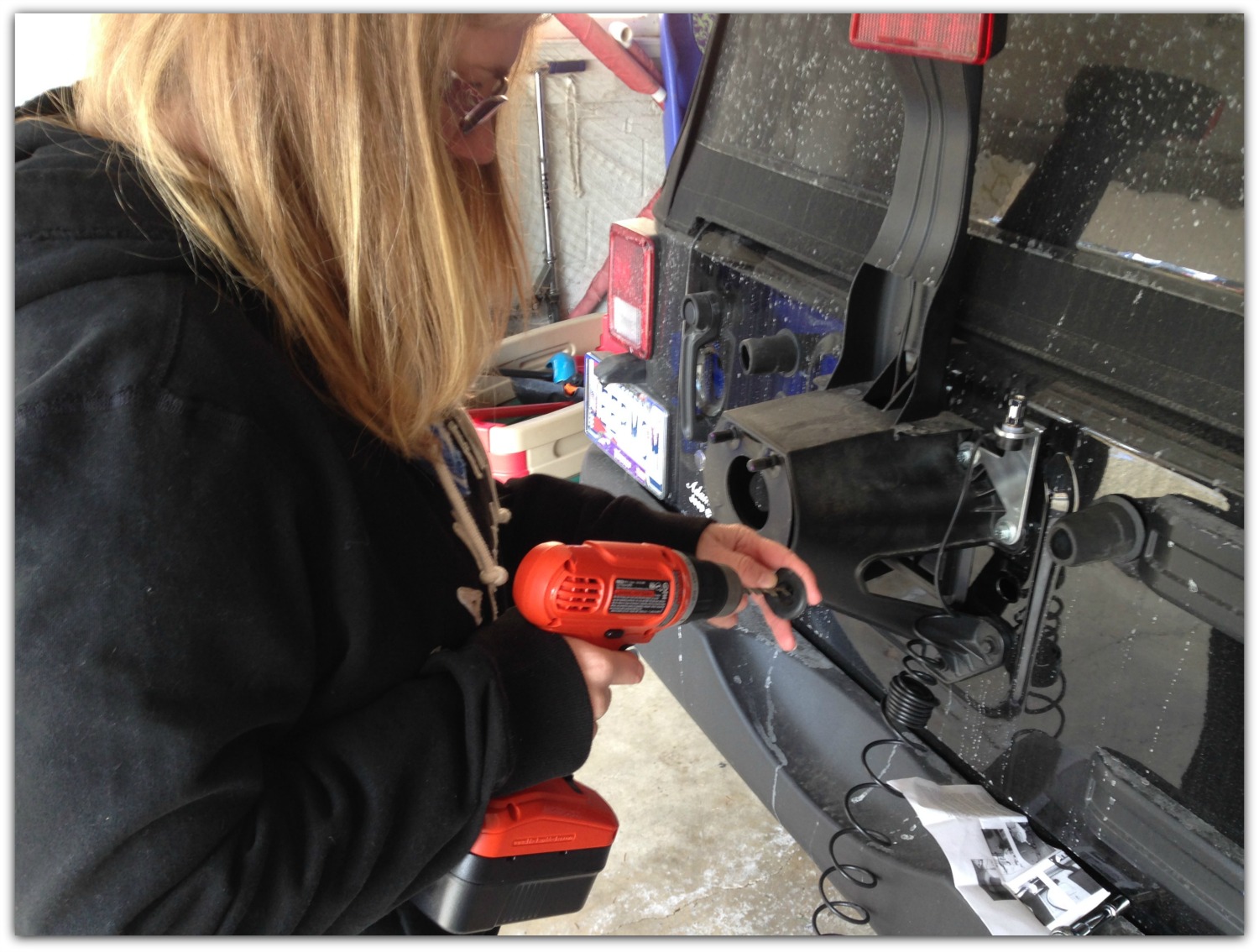 The next step was pulling the oval rubber grommet from the rear gate and drilling a hole in the rubber piece. This will allow the cable to pass through the door. This was my first time using a drill. I did not drill my fingers. Once I figured out how unsafe this was, I drilled the hole by placing the grommet on a board on the floor.