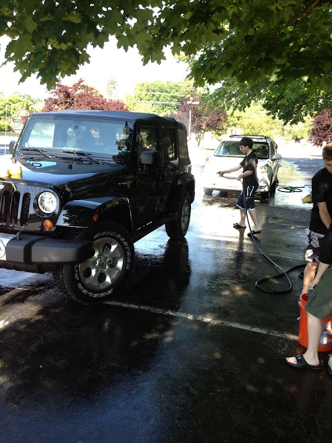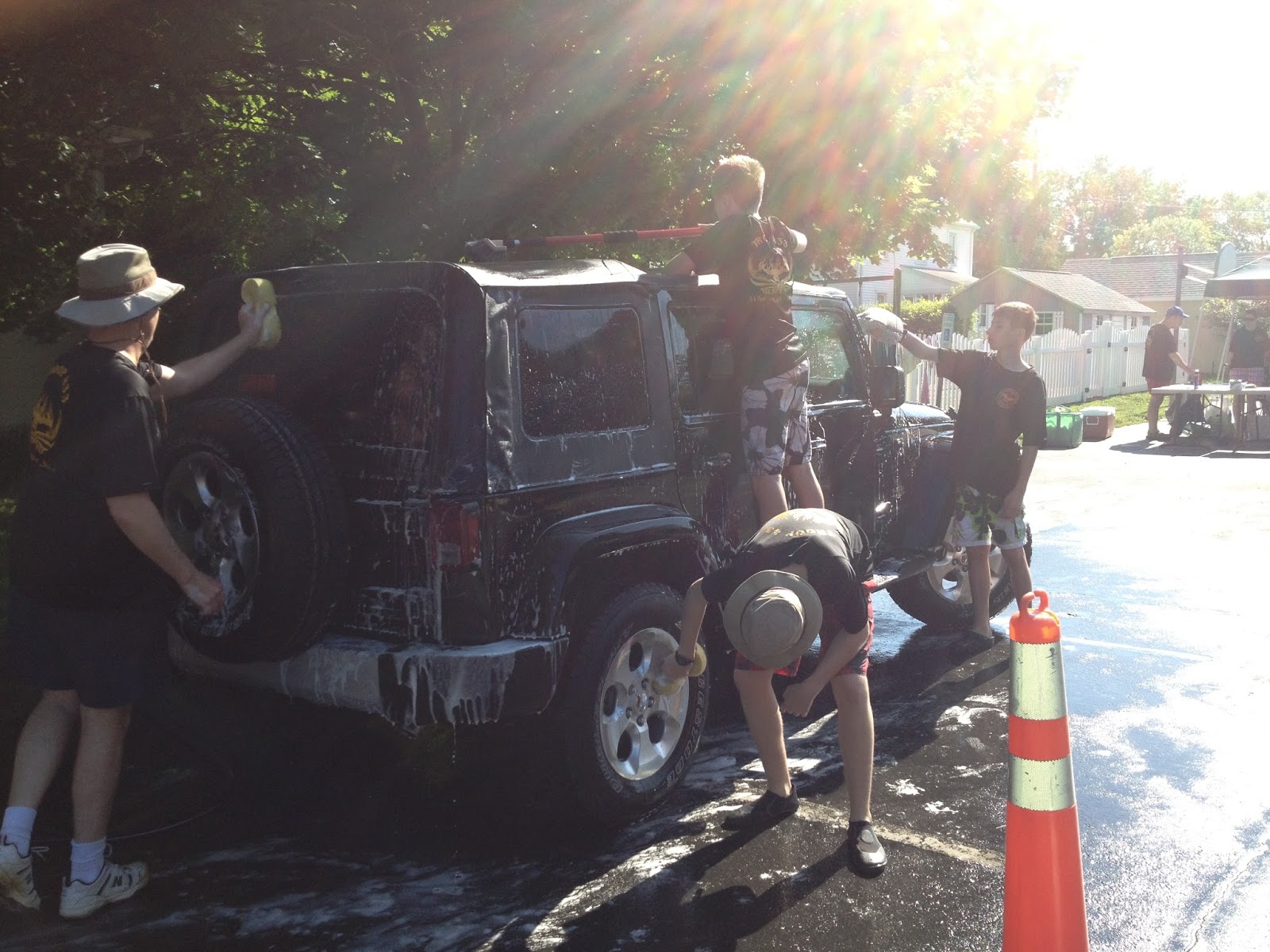My car BTJ (Before the Jeep) was pretty trashed with ketchup stains, chocolate stains, spilled sodas, bike handle bar scratches on the side, and baseball dents. Well, that is so not happening with my Jeep. I solemnly swear: I will empty the trash from my Jeep daily. I will keep up with the needed maintenance like oil changes and tire rotations. I will keep it shiny by washing it when it needs to be washed - which I'm told Jeeps are supposed to be dirty - but that's a question for another post. I like my new Jeep shiny. Now, here is where New Jeep Owner Tip #1 comes in. A week after I got my new Jeep I took it to my son's Boy Scout Car Wash fundraiser.