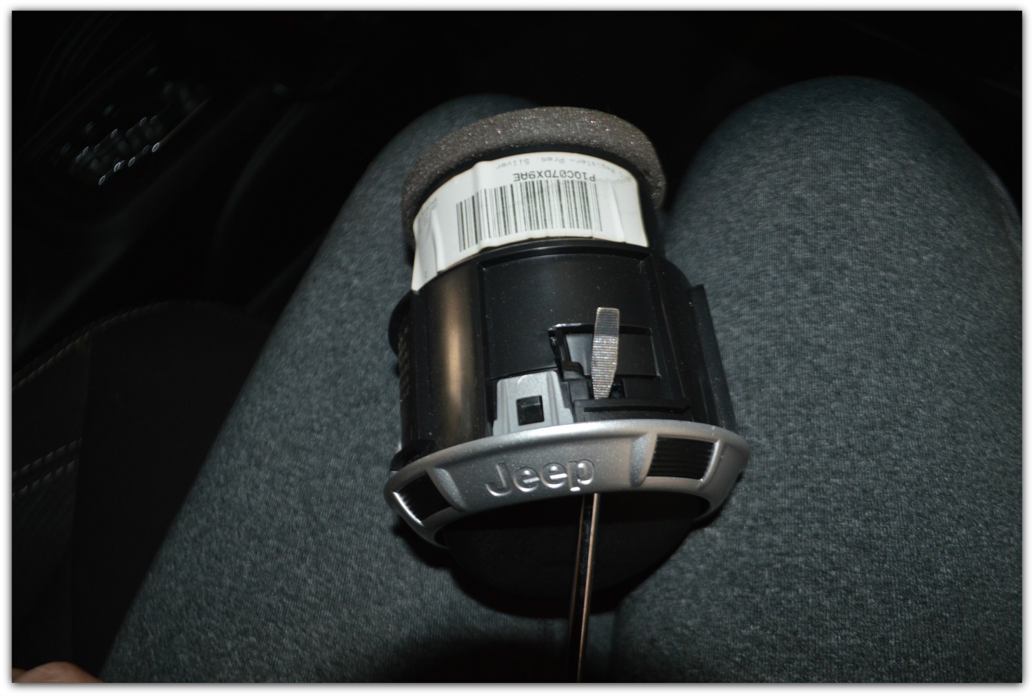 Next you align the vent with the Jeep letters at about the 11 o'clock position. The vent should slide into place. One the vent is in place you turn it clock-wise to lock it into place.