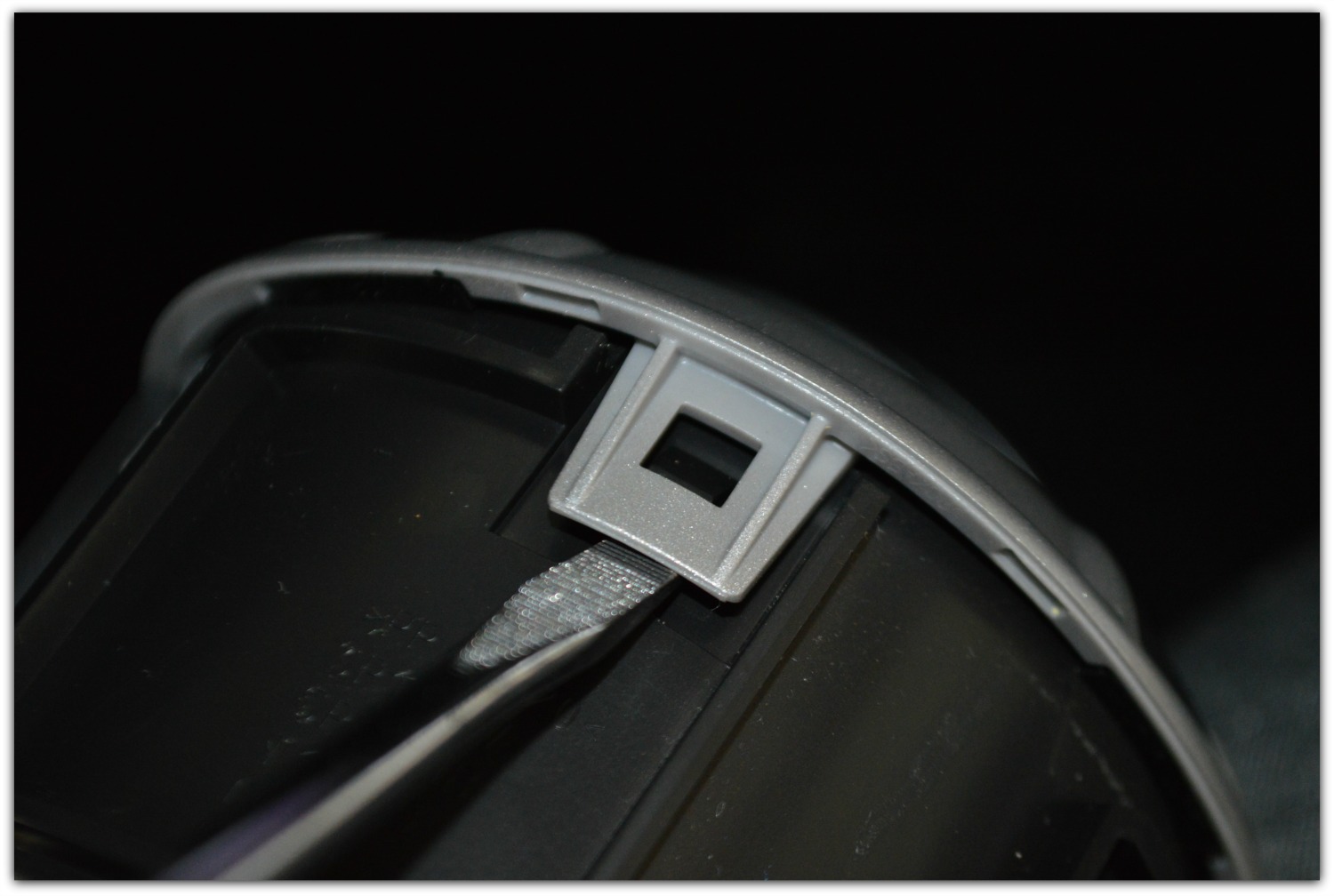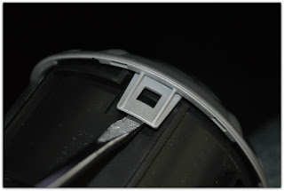 Once you remove the vent insert, gently place the screwdriver under -- so slightly -- to pop the silver tab. Do this with all the tabs around the ring.