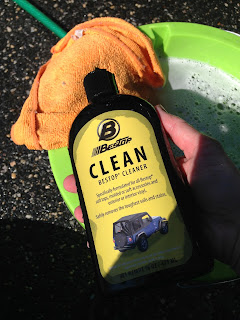 I save that type of cleaning for home with the Bestop Cleaners. When you do clean your soft top use soft microsoft cloths that are clean and wet.