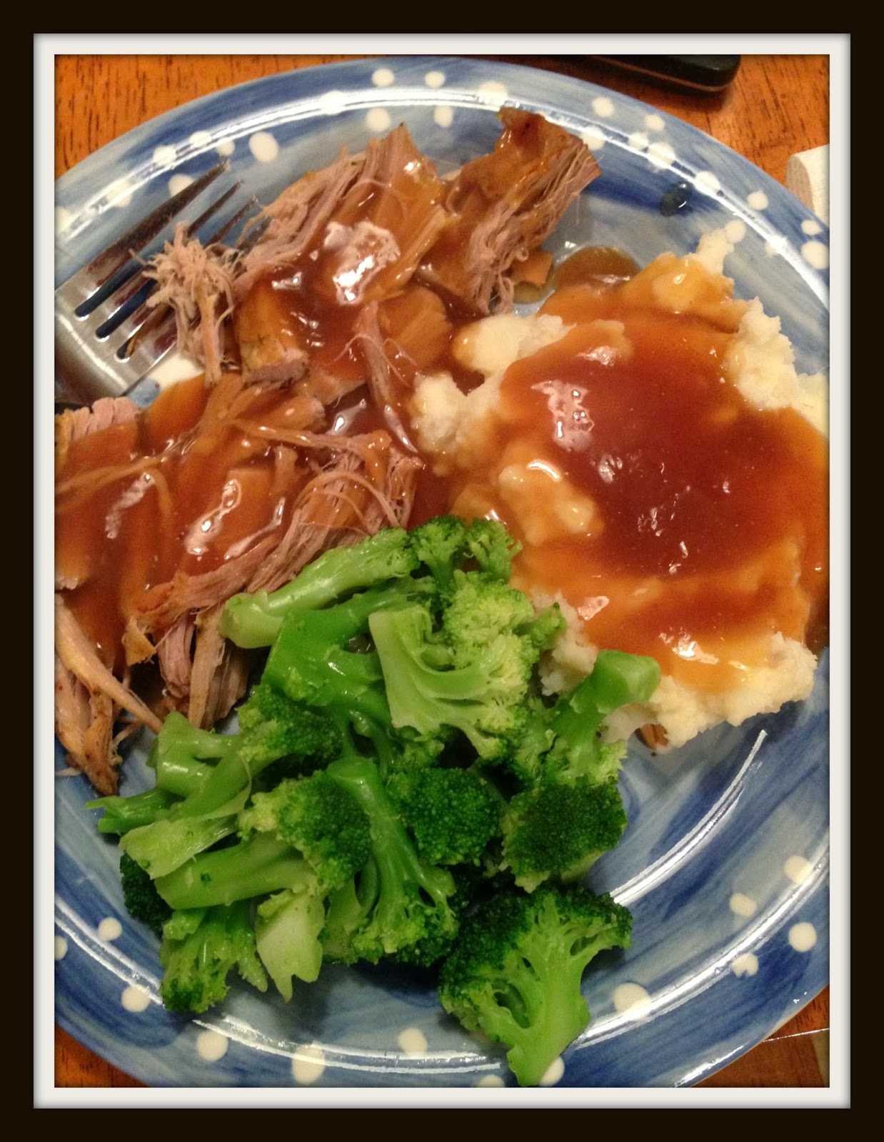 Pork Loin (slow cooked in the crock pot with garlic, salt & pepper), Mashed potatoes & gravy (my cheat for the week), and broccoli