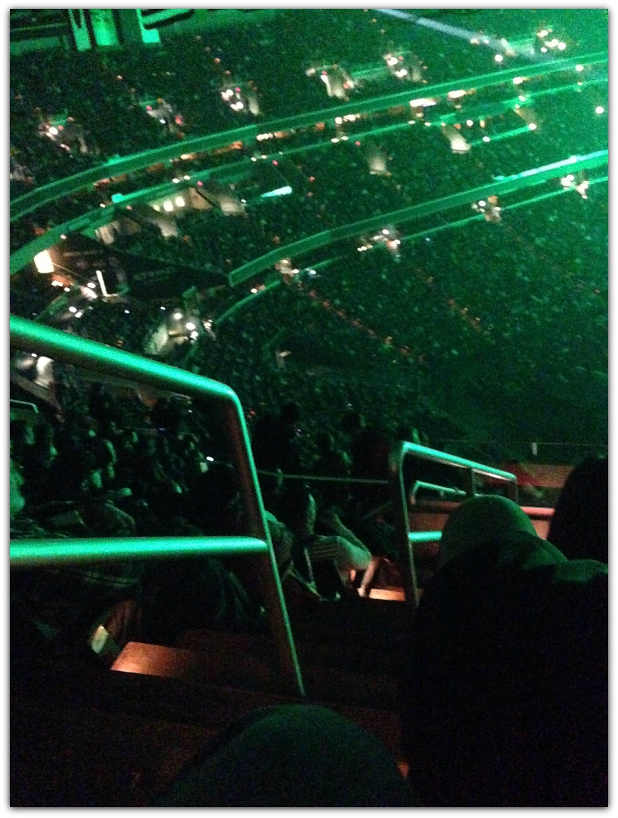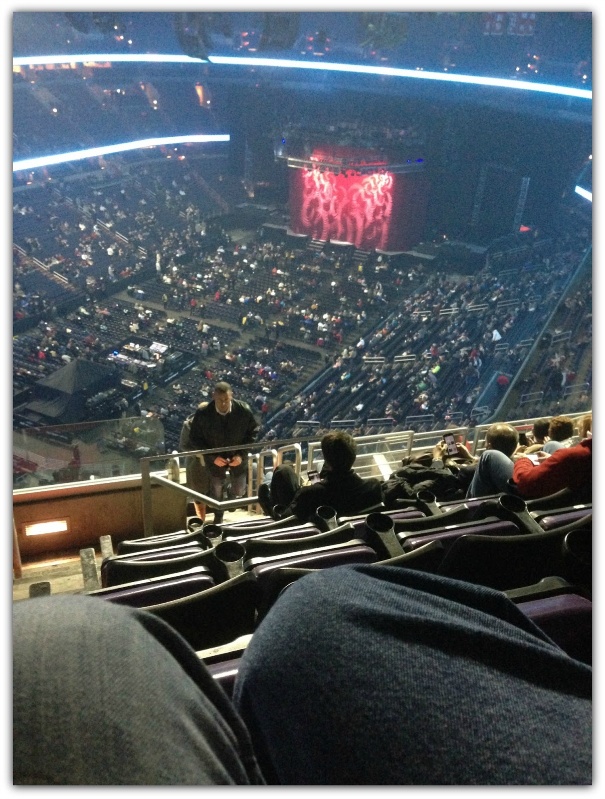 There was no turning back. I didn't think I would make it up to our seats - IN THE NOSEBLEED SECTION. I was carrying my coat under my arm with a glass of wine in my hand. I had one hand on the handrail as I walked slowly up the skinny stairs near the top of the arena.