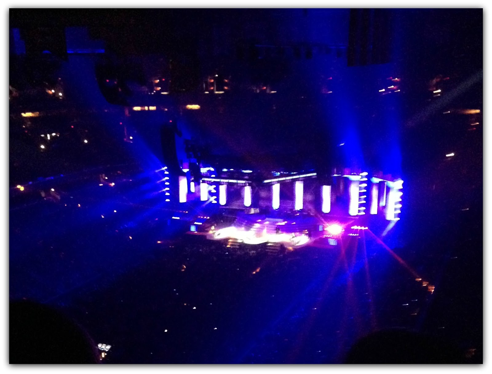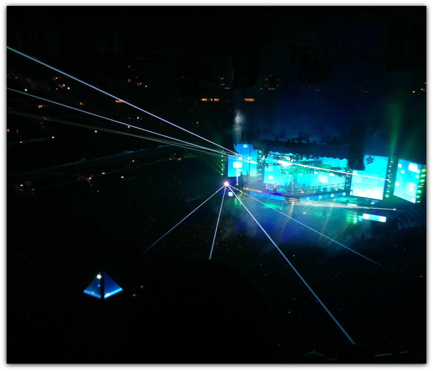 The concert had a fabulous light show with lasers, lights and fireworks. However, I didn't fully get to enjoy it as the flashing of the lights seemed to make my fear of heights worsen.