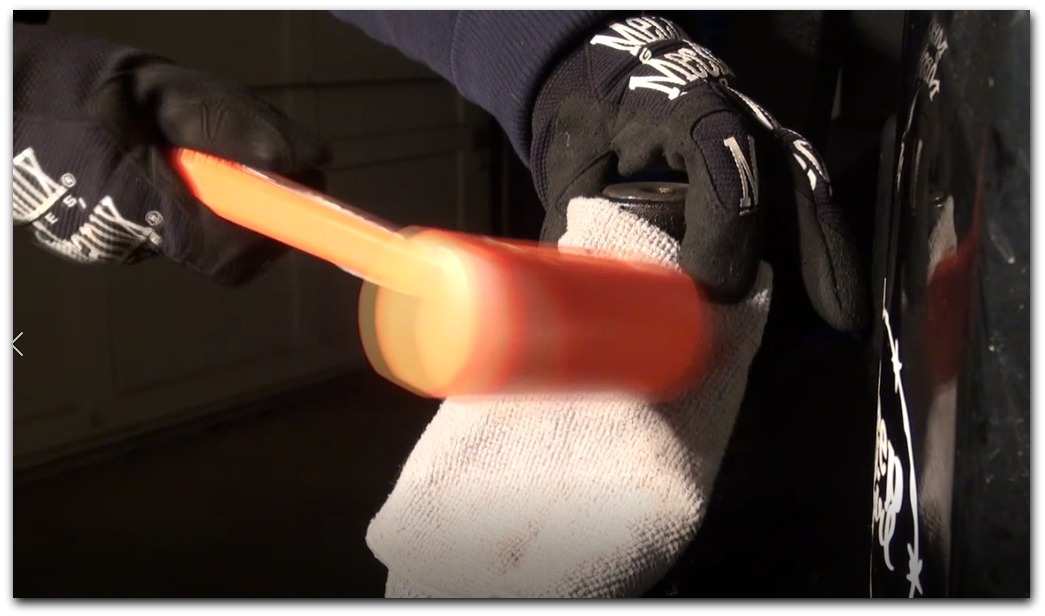Using a dead blow hammer, tap the swing arm where it connects with the post. I used a cloth so I wouldn't damage the paint. My tap was not gentle. In between hammer blows I would push the swing arm back and forth. I continued this process many, many times. I would say 10 to 20 times. It still would not budge. So I called my friend Henry for some help. He had a super gi-normous pry bar he said he could bring over. However, I needed to wait until the next morning. The next morning with the 5 foot pry bar it came right up. So I would say the PB Blaster and hammer blows helped loosen it up. The proper leverage to pull the swing arm straight up from the post made a big difference. Jeep Momma Tip - At least twice a year do some preventative maintenance by re-greasing your post if you have a spare tire carrier that swings.