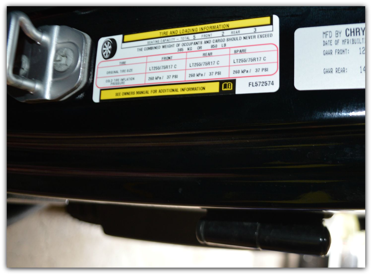 But how do you know what kind of spare tire your tire is? Some you can tell just by looking at them. They are smaller, we know them as donuts. But you can also tell by looking at the placard in your vehicle. I checked my placard on the driver's side door opening like the manual stated and it looks the the front, rear and spare are all the same -- lt255/75R17 C