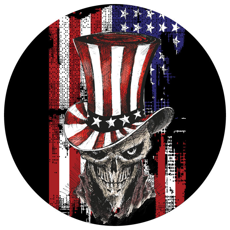 Rustic sketched patriotic American Flag skull spare tire cover for Jeep, RV, Bronco, campers, trailers, and more. A unique hand drawn creative skull design wearing a high top patriotic American flag hat and an American flag in the background.