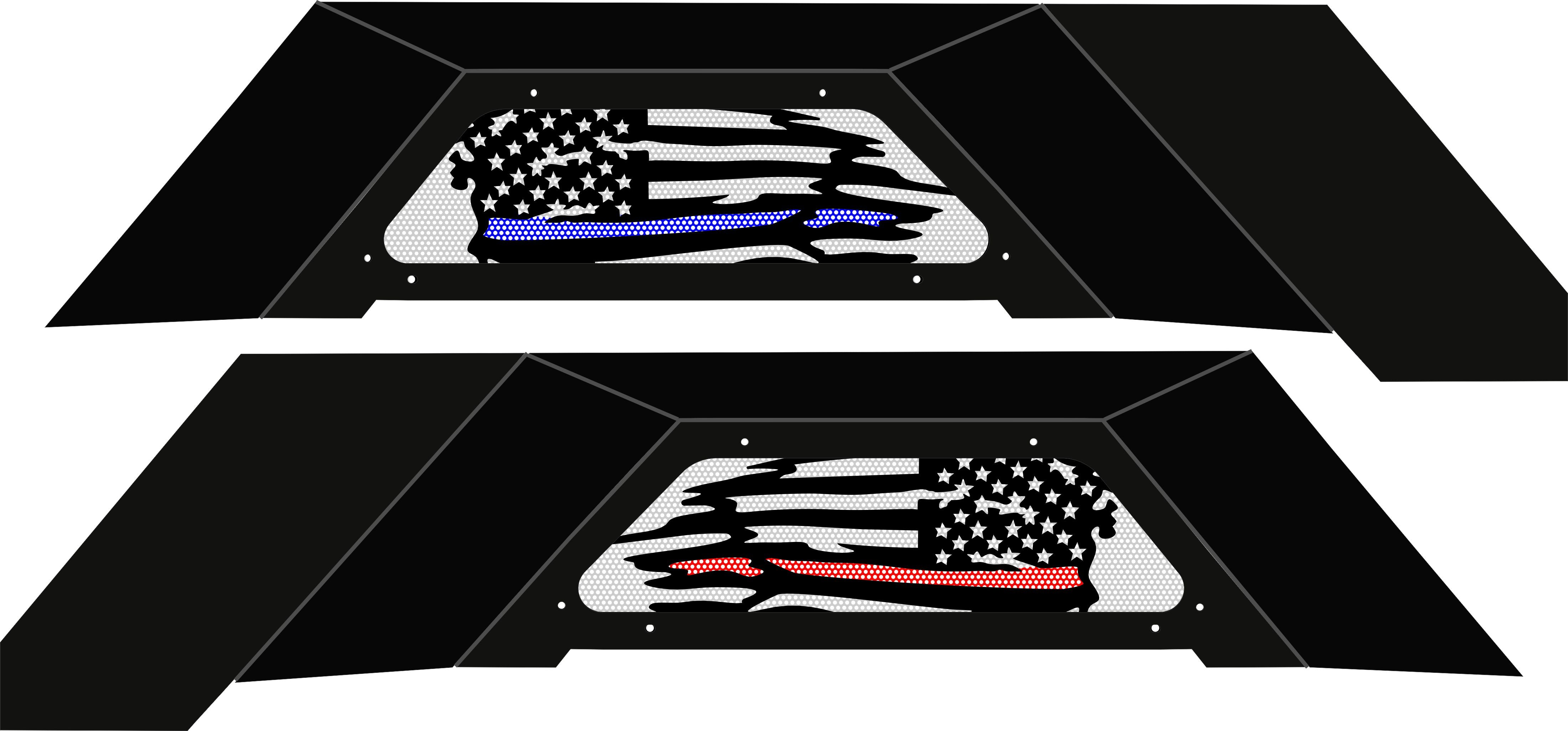 Custom designed and created in our fab shop- these inner fenders are perfect for any JK, JL, or JT. Featuring a large perforated mesh vent panel with flag design panel. Includes 1 driver side and 1 passenger side.
