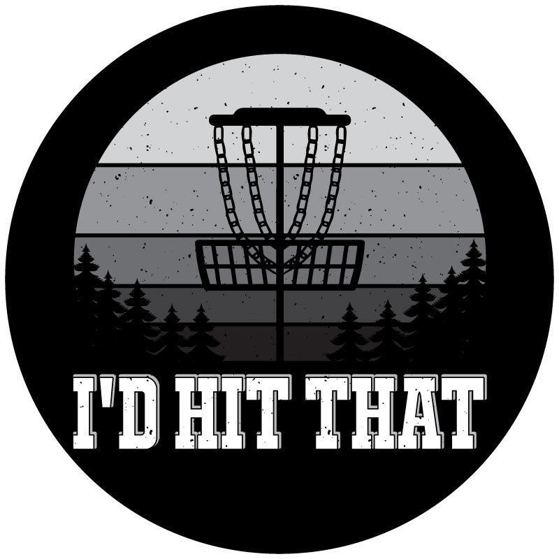 • Funny disc golf spare tire cover for Jeep, Bronco, RV, camper, and more. This design has the saying "I'd hit that" with a silhouette of a disc golf stand for black vinyl.