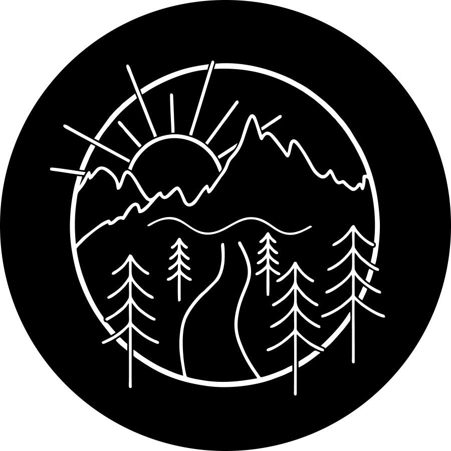 Simple line icon style drawing of the sun, mountains, trees and a pathway as if you were walking into the woods. This spare tire cover design is a high-quality custom-fit cover for any vehicle, make, model, and size - Jeep, RV, Travel Trailer, Camper, and more!