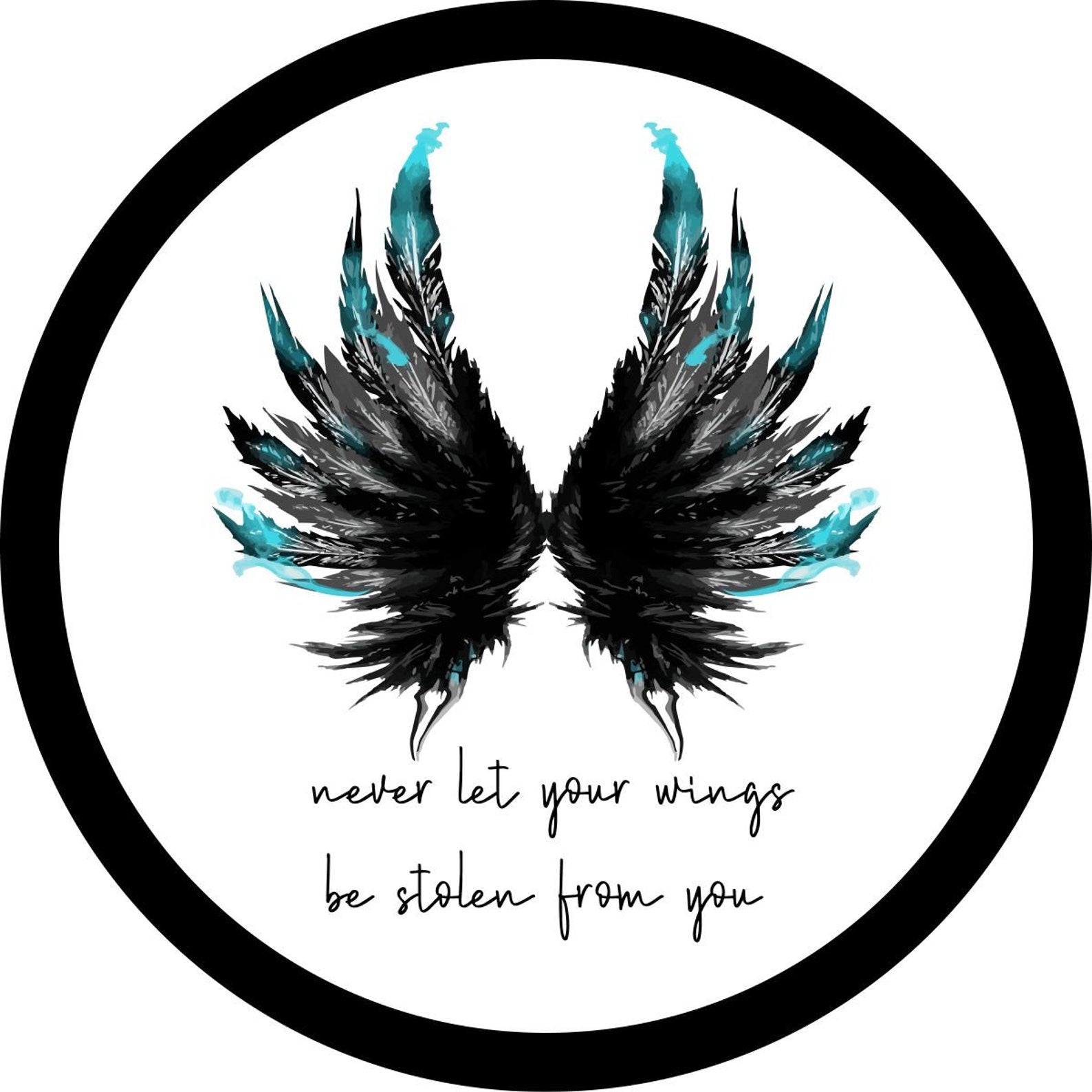 Angel wings in beautiful turquoise and black coloring with the sayings "never let your wings be stolen from you." This spare tire cover design is a high-quality custom-fit cover for any vehicle, make, model, and size - Jeep, RV, Travel Trailer, Camper, and more!