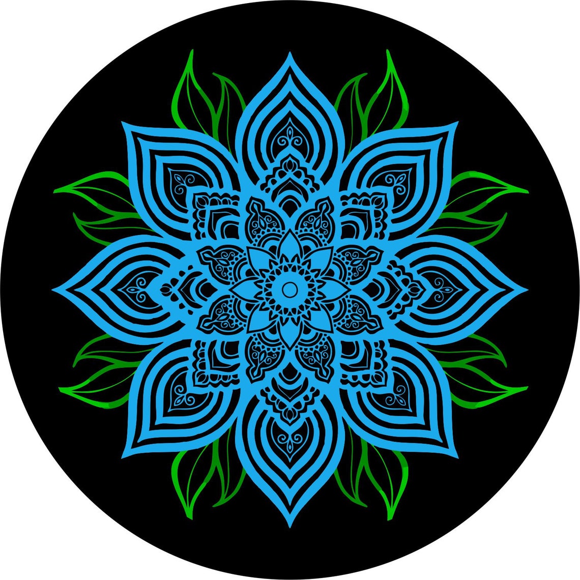 A blue mandala design for your vinyl spare tire cover. Put this design on your Jeep, Bronco, RV, Travel Trailer, Camper, and more!