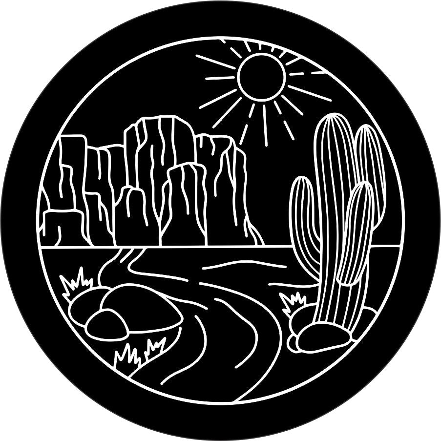 There's something beautiful in the arid terrain of the high desert. Those who have explored the harsh geography believe in both its beauty and the need to respect its often intolerable environment. This spare tire cover design captures the aesthetic of the desert in a simple line drawing design. The sun is shining down intensely upon the tough rocky topography with mountains in the distance and a giant cactus standing tall along a small river oasis.