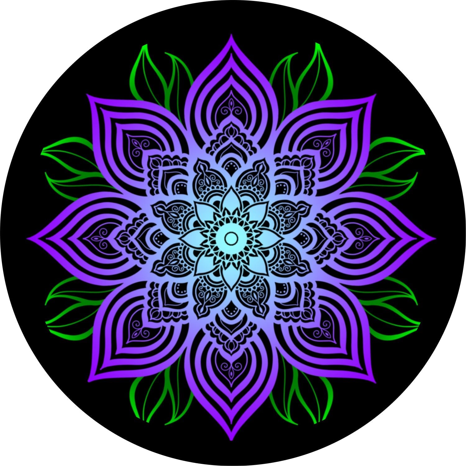 Purple Mandala Flower with Green Leaves. This spare tire cover design is a high-quality custom-fit cover for any vehicle, make, model, and size - Our spare tire covers can fit any tire for any model Jeep, RV, Travel Trailer, Camper, Bronco and more!